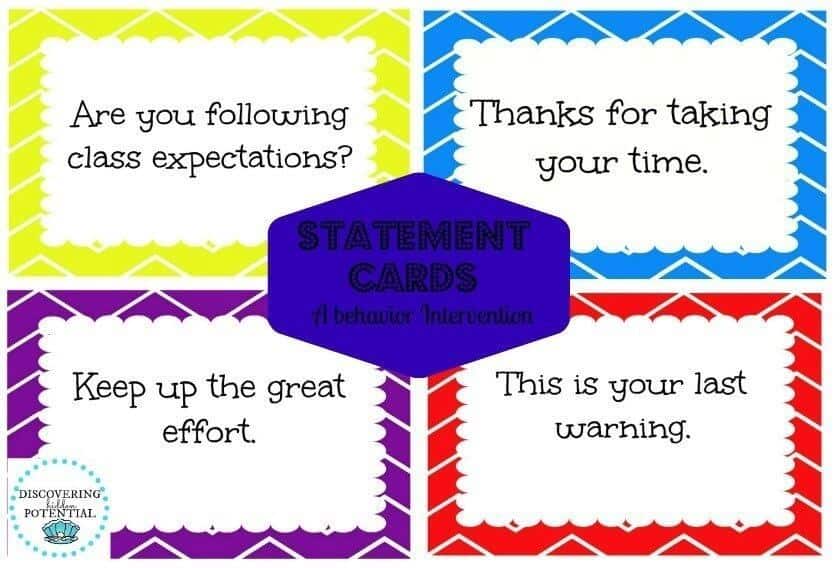 Inconspicuous corrections to student behavior are generally more effective than public displays for all students to see and hear. Public reprimands increase the chance of escalating the problem and can take away some of the student’s dignity. Statement cards are a great alternative strategy to use. The purpose of statement cards are to allow the teacher to redirect the student without stopping instruction and possibly becoming entangled in a power struggle. The teacher simply places the card on the student’s desk and continues with the lesson.