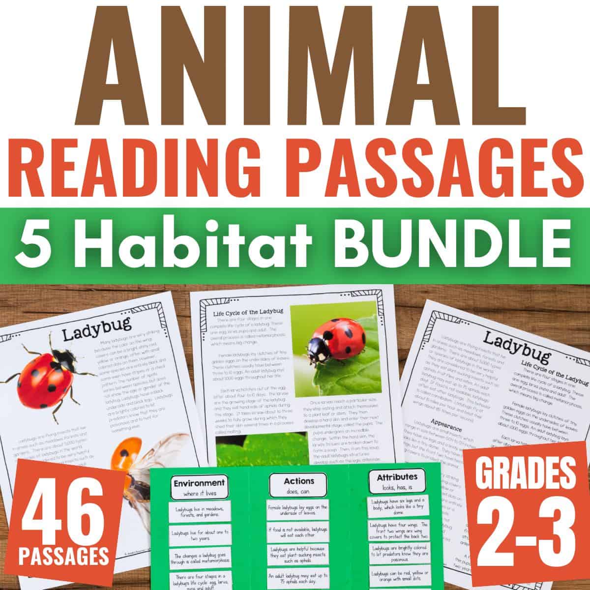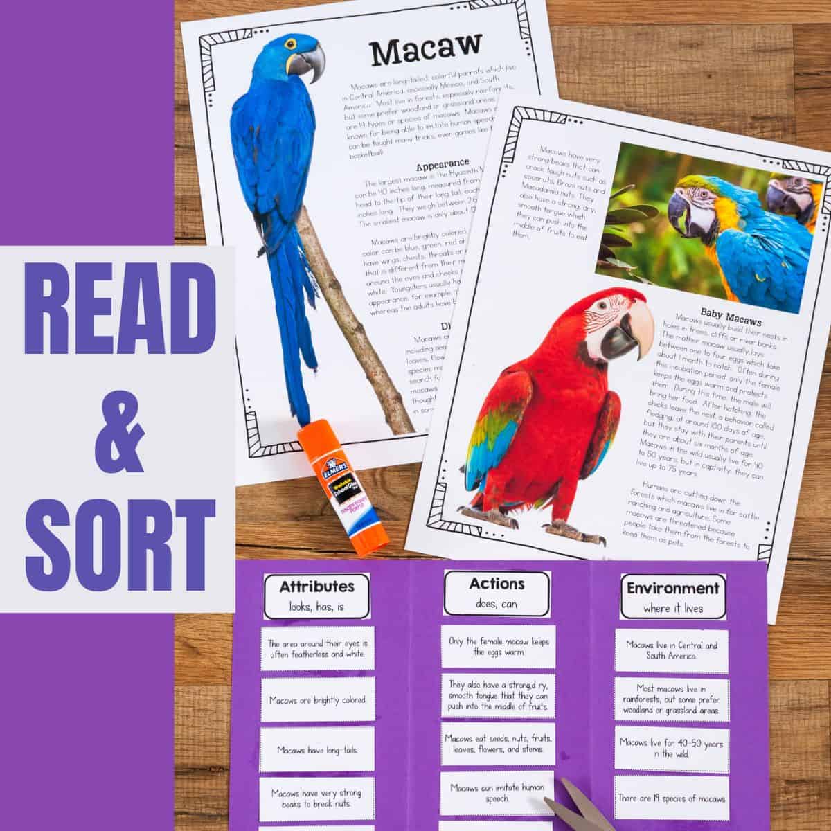 Includes an article about each animal in two formats (two-page color photos & one-page text), QR Codes for online articles and videos about the animal and a fact sort sheet where students can sort facts about each animal’s attributes, actions, and environment. Also included are a variety of reading comprehension activities, mini-report pages, and vocabulary cards for each animal article.