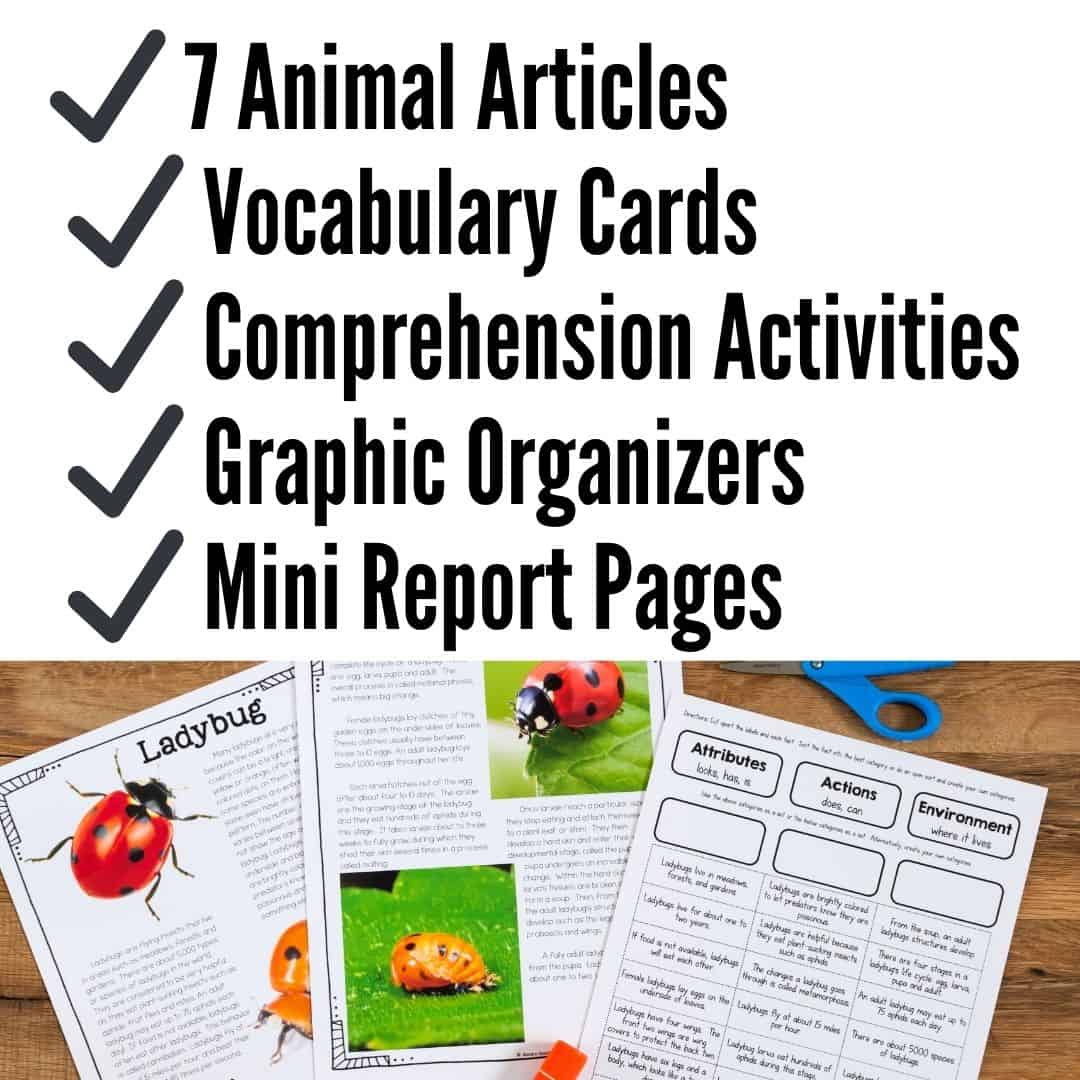 This product does not include any graphic organizers or comprehension questions. There are graphic organizers in the Informational Writing Tools packet or Graphic Organizers Product.