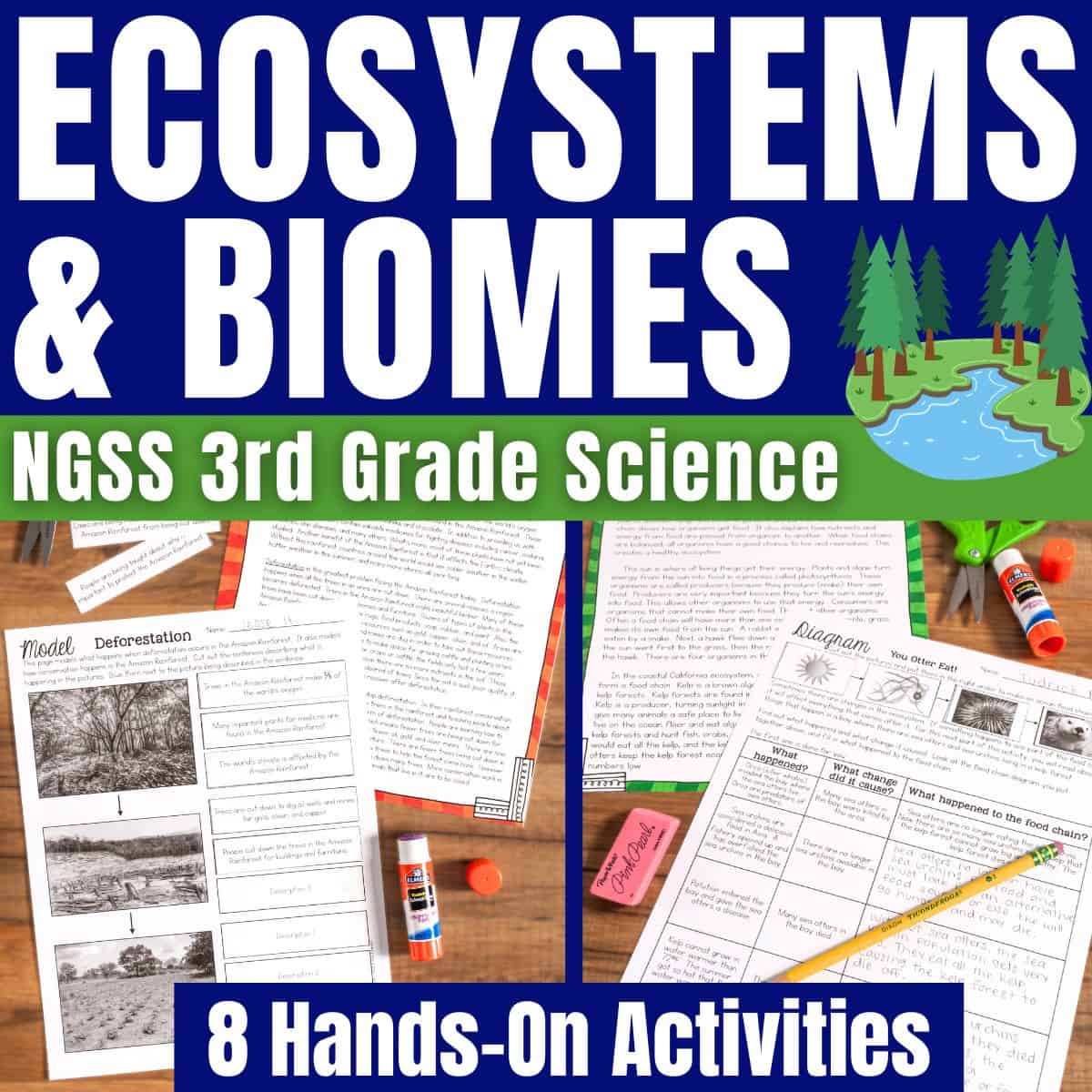 Ecosystems and Biodiversity Science Stations for Third Grade Next Generation Science Standards include 8 different science stations where students can deepen their understanding of how plants and animals live together within an ecosystem. The focus is on NGSS 3-LS2.C and 3-LS4.D and includes concepts such as food chains, food webs, traits of organism change due to environmental changes, how animals affect their environment, invasive species, and biomes.