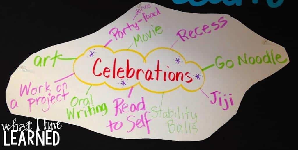 As a class, we brainstormed a variety of celebrations, both big and small. Most celebrations were for our class goals, but a few of these could be for individual goals, too. The idea was to get students excited about accomplishing their goals.