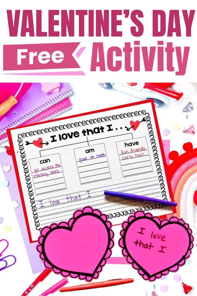 Students complete the prompt “I love that I…” and create a heart craft that highlights something positive about who they are. The focus stays on self-reflection, confidence, and classroom community rather than parties or candy.